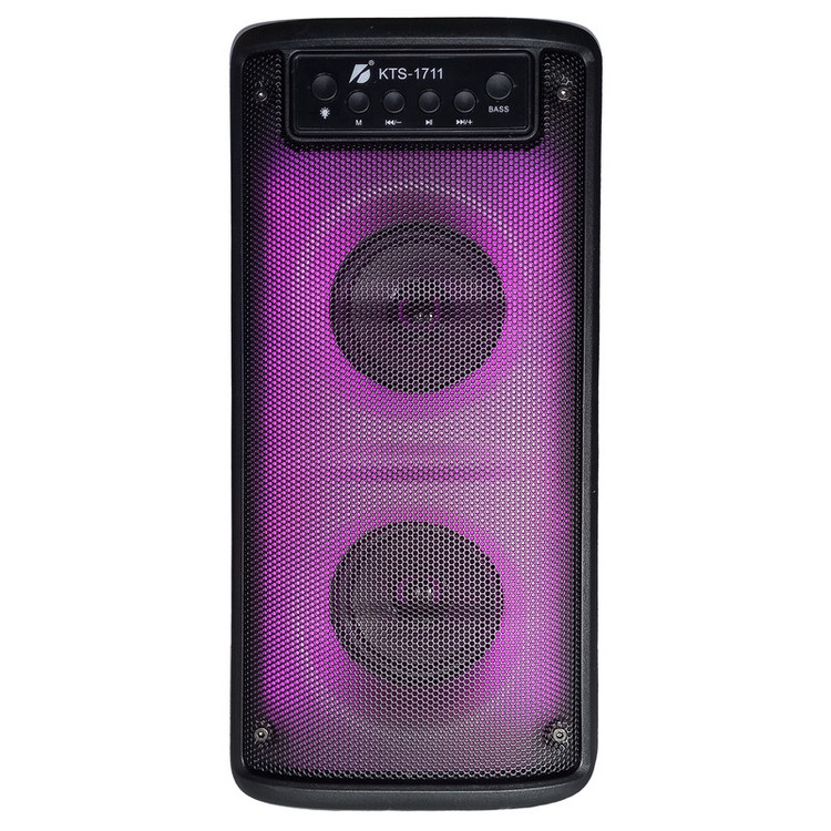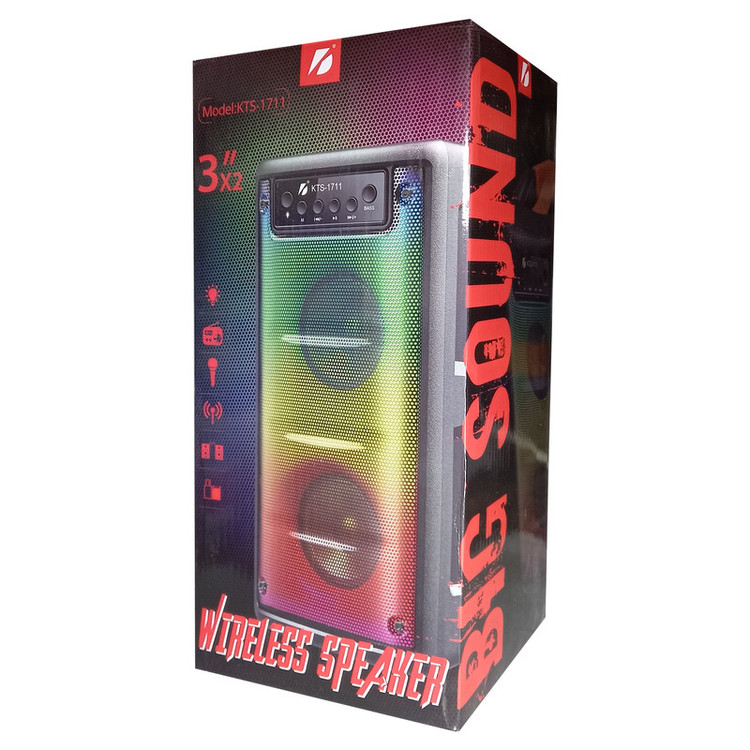 اسپیکر بلوتوثی قابل حمل KTS-1711 معرفی شده در سال 2023 از سوی کمپانی BIG SOUND مدل بهینه و به روز شده اسپیکر پر فروش و پر طرفدار KTS-1296 از همین برند می باشد که با توان خروجی 10 وات و ظاهر شیک و جدید و زیبا یکی از بهترین گزینه ها برای لذت بردن از موزیک می باشد. این اسپیکر دارای دو باند 3 اینچی و دارای رقص نور بهینه و جدید و حالت اکولایرز می باشد که هنگام پخش موزیک زیبایی دو چندانی به اسپیکر میدهد. پشتیبانی از کارت حافظه و فلش مموری ، بلوتوث ، ورودی AUX و قابلیت اتصال میکروفن از ویژگی های این اسپیکر قدرتمند می باشد . و قابلیت TWS نیز به شما این امکان را می دهد که با خرید دو دستگاه از این مدل آنها را جفت سازی کرده و همزمان از دو اسپیکر از طریق بلوتوث بخش صدای استریو را دریافت کنید . با این امکان به راحتی می توان یک مهمانی و و یا یک جشن تولد را پوشش داد