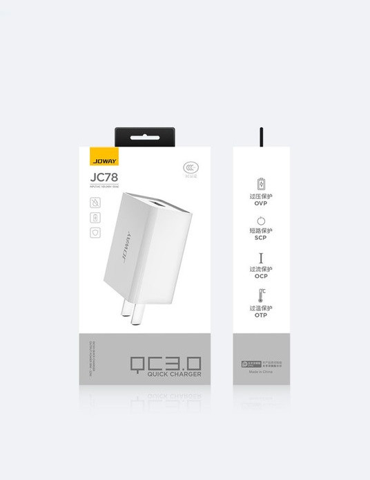 امروزه شارژر های بسیاری در بازار موجود می باشند اما همچنان شارژر های سیمی بیشترین سرعت را دارند و ایمن تر هستند. شارژر JC78 محصولی از کمپانی خوش نام Joway بوده که دارای یک پورت USB می باشد و به شما امکان شارژ گوشی موبایل را با سرعت 5V-3A را می دهد که سرعت بسیار بالایی برای شارژ گوشی های همراه محسوب می شود. این شارژر مجهز به فناوری Qualcomm3.0 بوده که در صورتی که گوشی شما هم دارای این فناوری باشد قادر خواهید بود گوشی خود را با سرعت بسیار بالا شارژ بکنید. جنس بدنه این شارژر از پلاستیک + ABS و متریال PC بوده که مقاومت بسیار بالایی در برابر ضربه ، فشار و حرارت دارد. شما این شارژر را نمی توانید به صورت مستقیم به پریز های ایران متصل کنید و باید حتما از تبدیل استفاده کنید. در پک شارژ joway JC78 یک کابل هم قرار داده شده تا کاربر بتواند با استفاده از آن به راحتی گوشی موبایل خود را با سرعت بالا شارژ بکند.