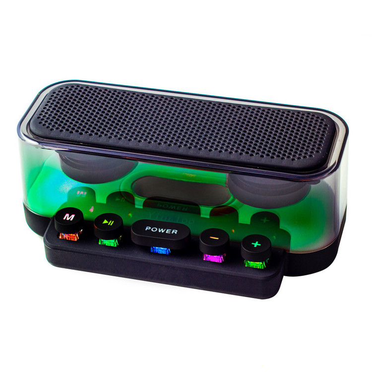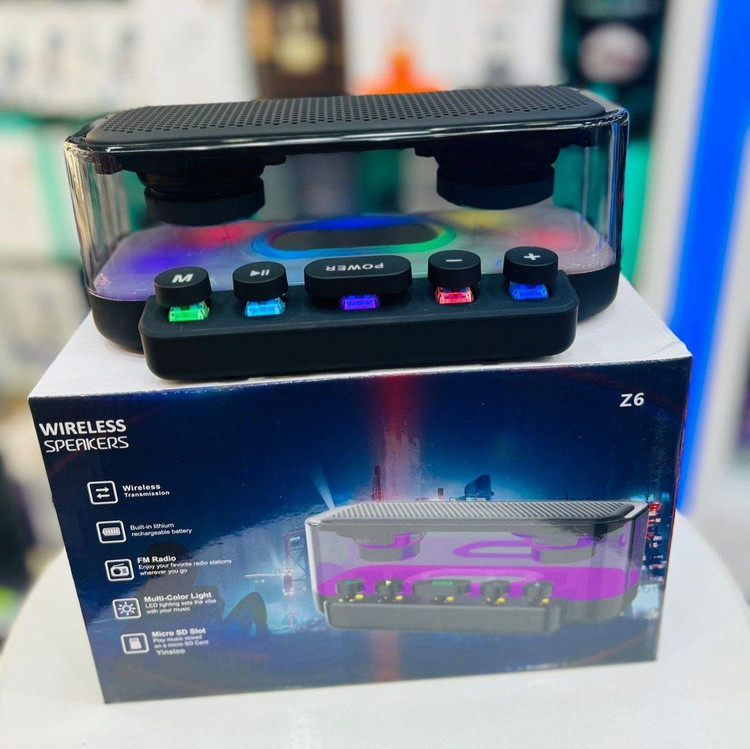 اسپیکر بلوتوثی مدل Z6 یک محصول جدید و کاملا متفاوت از نظر طراحی و متریال ساخت میباشد.جنس بدنه از پلاستیک جیر مانند و شیشه دودی نشکن میباشد و داخل محفظه شیشه ای نور پردازی RGB به همراه یک عدد ساب ووفر و 2 عدد اسپیکر 6 سانتی تعبیه شده است که ظاهری بسیار زیبا، لوکس و صدایی بسیار با کیفیت را دارا میباشد.کلید های این اسپیکر از نوع مکانیکال میباشد که حس خیلی خوبی را موقع استفاده به یوزر خود به ارمغان می آورد.