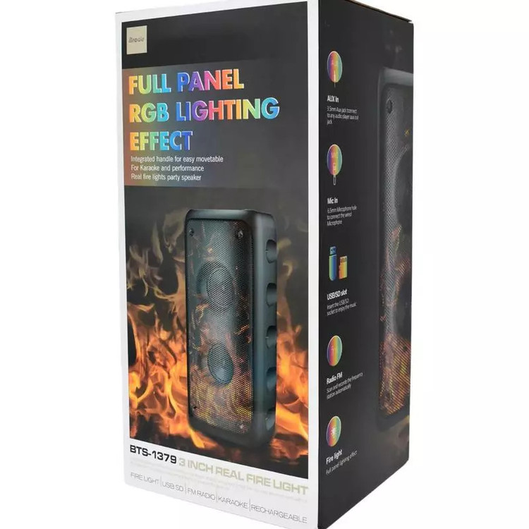 اسپیکر مدل Brodu BTS-1379 از فناوری اتصال بلوتوث بهره برده است .این اسپیکر دارای بدنه فایبر محکم و ضد خش با کیفیت صدای بی نظیر می باشد.همچنین دارای فول پنل ال ای دی با چندین حالت رقص نور بی نظیر می باشد. اسپیکر بلوتوث قابل حمل Brodu BTS-1379 دارای ورودی میکروفون / شیار کارت حافظه / USB / AUX / BlueTooth / رادیو FM و پنل کنترل موزیک ( دکمه های قطع و وصل موزیک ، کم و زیاد ، موزیک قبل و بعد ، دکمه Bass ، دکمه تغییر مدل LED ، دکمه تغییر MODE ) و کابل شارژر و دفترچه راهنما می باشد. Brodu BTS-1379 از یک باتری 2400 میلی آمپر لیتیومی برخوردار است که تامین انرژی می کند . همچنین از دو ساب ووفر 3 اینچی 10 وات بهره می برد و به دو صورت بی سیم و با سیم کاربرد دارد.همچنین دارای قابلیت فوق العاده جذاب ست شدن با دستگاه دیگر (TWS) را دارد. برای ست کردن دو بلندگو باهم کافیست هر دو را روشن کرده ، روی حالت بلوتوث قرار دهید و دکمه M روی یکی از اسپیکرها را 2 ثانیه نگه دارید تا صدای بوق شنیده شود ، سپس بلوتوث گوشی را متصل کنید تا صدای موزیک از هر دو اسپیکر پخش شود.