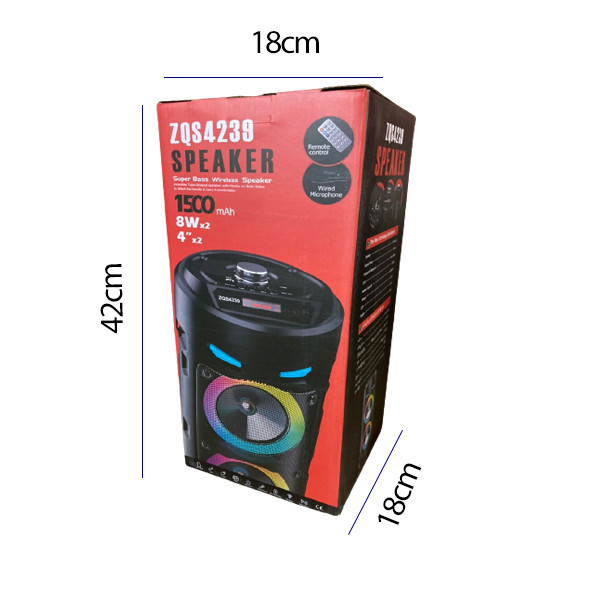 بلندگوی قابل حمل 8 اینچ بلندگو داخلی بی سیم بلوتوث بی سیم بلوتوث قابل حمل کارائوکه بسیار بلند. دارای 2 اسپیکر 4 اینچ با شکلی بسیار زیبا و مناسب برای محیط های بسته و باز. بر روی اسپیکر ZQS4239 کنترل کننده میزان بلندی صدا ، درگاه ورودی Micro SD ، درگاه وردی کابل Micro USB برای شارژ اسپیکر ، کلید های کنترل کننده موزیک و تغییر مد، ورودی کابل میکروفون و ورودی کابل AUX است.