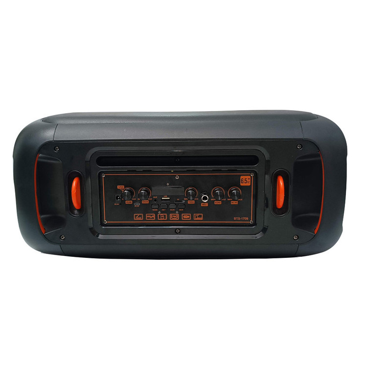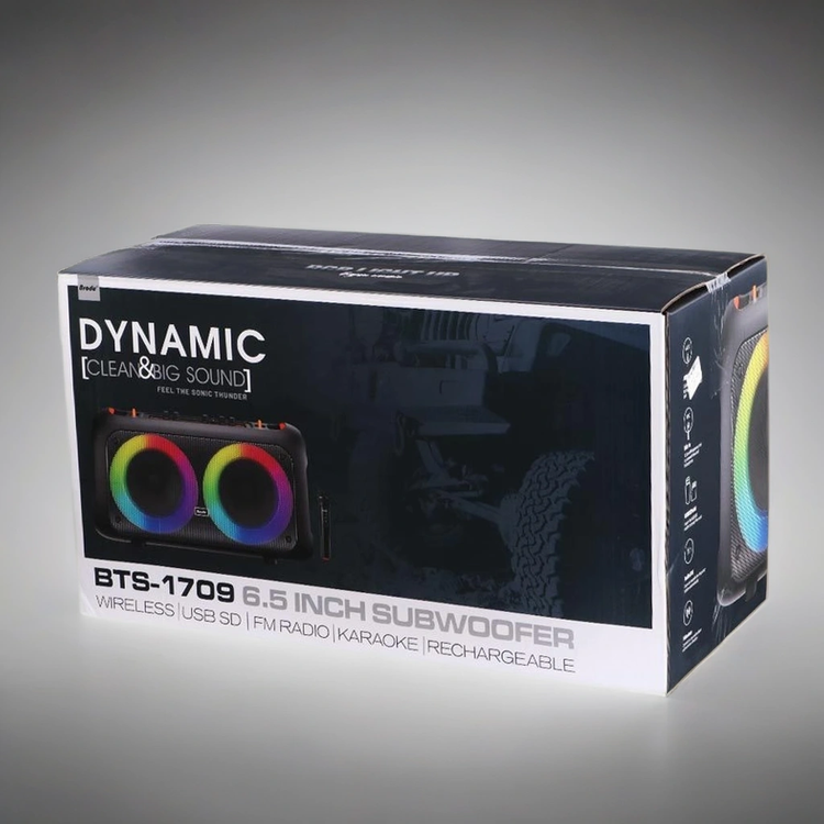 اسپیکر قابل حمل مدل BTS-1709 یک گزینه مناسب و کاربردی جهت آن دسته از عزیزانی است که به دنبال اسپیکر قابل حمل شیک و با کیفیت مناسب هستند و تصمیم به هزینه کردن بودجه کمتری نسبت به نمونه های اصلی دارند. این اسپیکر قابل حمل بی سیم بوده و با استفاده از بلوتوث قابلیت اتصال به دستگاه های دارای بلوتوث را دارا میباشد، همچنین نور پردازی زیبای آن در گرداگرد بلندگو ها زیبایی چشمگیری به ظاهر آن داده است.