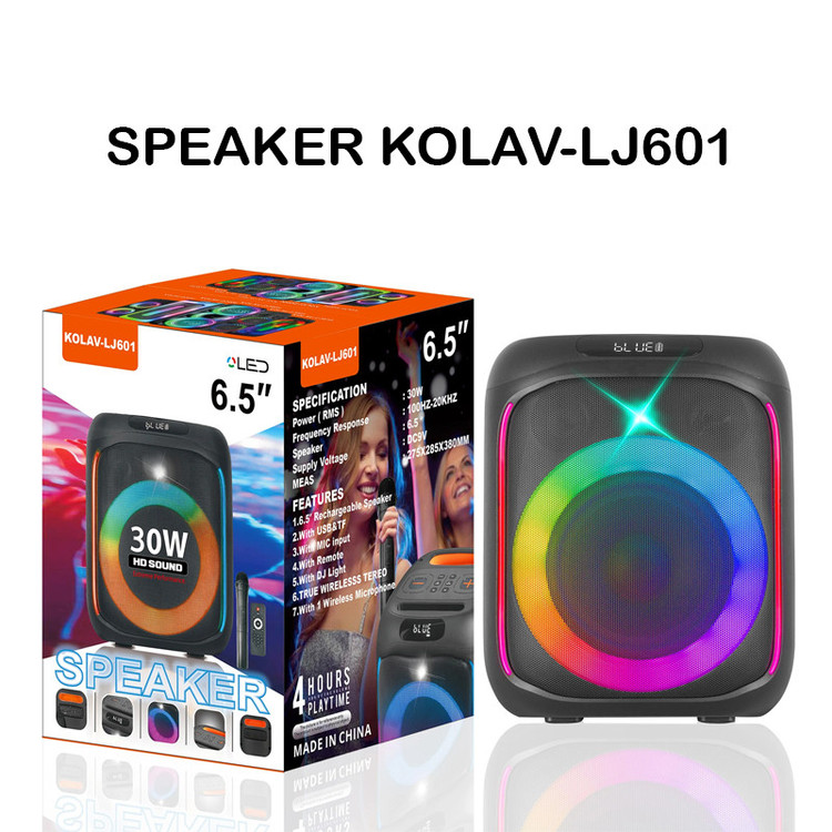 اسپیکر بلوتوثی قابل حمل مدل KOLAV-LJ601، یکی از محصولات شرکت KOLAV است که با توجه به ابعاد و وزن نسبتا مناسب خود میتواند در هر جایی لذت گوش دادن به موسیقی را برای کاربران فراهم کند. قسمت جلویی این اسپیکر میزبان نورپردازی RGB است تا این اسپیکر بتواند صدا را به صورت مستقیم و با بیشترین کیفیت به گوش کاربران برساند و جلوههای بصری بسیار زیبایی به آنها ارائه کند. پورتهای اتصال باسیم این اسپیکر در قسمت پشتی آن قرار دارند و به هیچ عنوان زیبایی قسمت جلویی این محصول را دچار اختلال نمیکنند. کلیدهای کنترل موسیقی و صدا هم در قسمت بالایی اسپیکر بلوتوثی KOLAV-LJ601 قرار دارند و دسترسی به آنها کار دشواری به نظر نمیرسد. درایو اصلی KOLAV-LJ601 قابلیت ارائه توان خروجی حداکثر 30 وات را در بازه فرکانسی 100 هرتز الی 20 کیلوهرتز ارائه میکند تا بلندی و شفافیت صدای نسبتا مناسبی را هنگام گوش دادن به موسیقی از این اسپیکر شاهد باشیم. اتصالات اسپیکر به حافظه جانبی و دستگاهها توسط پورتهای USB، شیار کارت حافظه Micro-SD و درگاه 3٫5 میلیمتری AUX انجام میشود. امکان اتصال بدون سیم نیز توسط بلوتوث داخلی KOLAV-LJ601 وجود دارد و کاربران به سادگی میتوانند تلفن همراه، تبلت و دیگر دستگاههای بلوتوثی خود را به سادگی با این اسپیکر همگامسازی کنند. از دیگر قابلیتهای این اسپیکر میتوان به امکان استفاده از آن به عنوان استند تلفن همراه اشاره کرد که قابلیت منحصربهفردی برای یک اسپیکر شمرده میشود. تامین انرژی این اسپیکر نیز برعهده باتری 3600 میلیآمپر ساعتی است که از شارژدهی مناسبی نسبت به بلندی صدا برخوردار است.