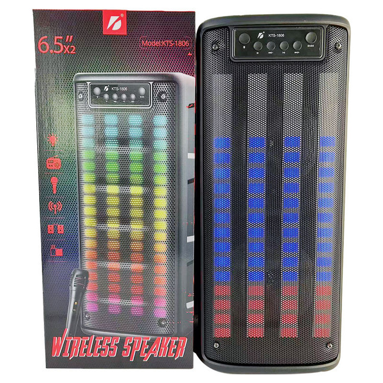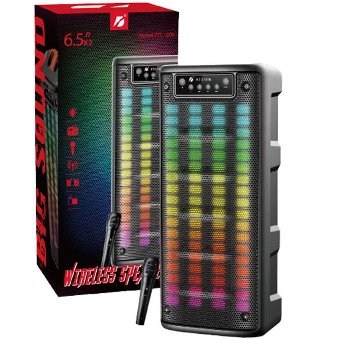 اسپیکر قابل حمل kts 1806 محصولی با طراحی زیبا از شرکت کی تی اس است که علاوه بر حجم زیاد صدای خروجی و شفاف در ابعادی وسیع، برای برگزاری مهمانی ها و مجالس به یکی از منحصر به فردترین اسپیکرها تبدیل کرده است. اسپیکر بی سیم KTS مدل 1806 به عنوان یکی از بهترین اسپیکرهای قابل حمل می باشد که هم می تواند به صورت بی سیم از طریق بلوتوث و هم از طریق سیم توسط کابل صوتی AUX موجود بر روی دستگاه , موسیقی خود را پخش و گوش کنید. از ویژگیهای خوب KTS 1806می توان به متصل شدن از طریق پورت USB , شیار کارت حافظه و جک 3.5 میلیمتری صدا به پلیر مد نظرتان اشاره کرد و با ریموتی که دارد به راحتی از فاصله نهایت 10 متری کنترل کنید. اسپیکر بلوتوثی قابل حمل برند KTS ظاهری شبیه اسپیکرهای چمدانی دارد. ابعاد این اسپیکر استاندارد و جنس بدنه آن از پلاستیک با کیفیت می باشد همچنین محدوده فرکانس پاسخ گویی این مدل از محصولات KTS هم 100-20000 هرتز , صدای موسیقی را با وضوح بالا و بیس قدرتمندی پخش می کنند و باعث افزایش هیجان مهمانی شما می شوند