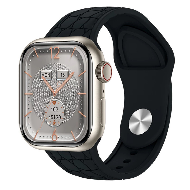 ساعت های طرح اپل 42mm با کیفیت در بازار بسیار کم است. ساعت هوشمند HK9 Mini Plus یکی از با کیفیت ترین ساعت های طرح اپل است. بدنه این ساعت هوشمند را از فلز با کیفیت در سه رنگ مشکی، سیلور، صورتی طراحی کرده اند. یک صفحه نمایش 1.75 اینچی نیز درون این قاب مستطیل شکل قرار دارد. در سمت راست دو دکمه وجود دارد که یکی از نوع چرخشی و فشاری و دیگری از نوع فقط فشاری می باشد. در سمت چپ نیز اسپیکر را قرار داده اند. درون جعبه این محصول دو بند وجود دارد که یکی از نوع سیلیکونی می باشد که روی آن طرح هایی شبیه به پوست مار طراحی شده است. و دیگری از نوع پارچه ای است. مانند همه ساعت های هوشمند طرح اپل، این مدل نیز دارای یک صفحه نمایش مستطیل شکل است که یک قاب فلزی آن را در بر گرفته است. صفحه نمایش ساعت hk9 mini plus از نوع امولد می باشد که سایزی برابر با 42mm دارد. راحتی کار با این صفحه نمایش زمانی حس می شود که شما در طول روز بین گزینه های مختلف جا به جا می شوید و از آنجایی که صفحه نمایش آن 60 هرتزی می باشد کاملا روان بدون هیچگونه لگ می تواند برای شما کار را انجام دهد. یکی از قابلیت هایی که این روزها در ساعت های هوشمند ترند شده است اتصال آن به ایرپاد است. تا قبل از این قابلیت به این شکل بود که ایرپاد و ساعت هر دو به گوشی موبایل متصل می شد. اما در حال حاضر و در ساعت HK9 Mini Plus شما می توانید ساعت هوشمند خود را به صورت مستقیم و بدون نیاز به گوشی موبایل به ایرپاد خود وصل کنید. با توجه به وجود میکروفون و اسپیکرهای با کیفیت در این مدل ساعت هوشمند می توانید از قابلیت مکالمه در آن استفاده کنید و مکالمه با کیفیت را تجربه کنید.