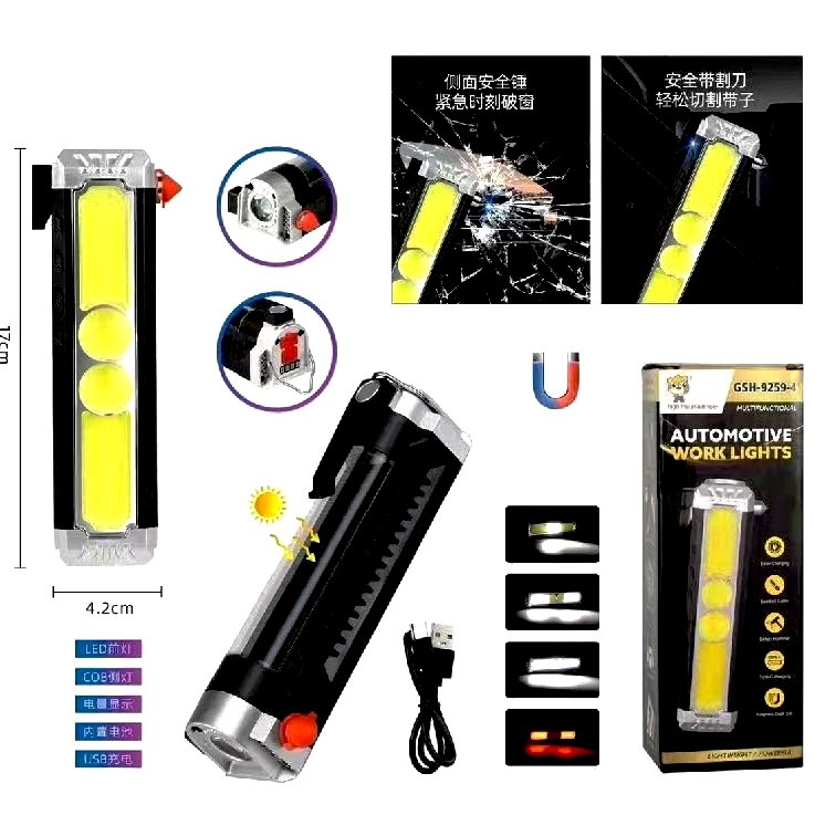 چراغ قوه مدل GSH-9259 دارای 6 حالت نوری میباشد که یکی از انها بصورت چراغ خطر قرمز است. این کالا در چندین تنوع نوری میباشد که بصورت عادی و فلش دار عمل میکند. همچنین نوع شارژ این مدل هم بصورت سولار پنل خورشیدی است که در زمانی که برق نیست میشود استفاده کرد از طریق شارژ گرفتن از نور خورشید و هم بصورت کابل شارژ. همچنین یک مگنت اهنربایی در پشت دارد که میتوان برای نصب روی اجسام فلزی بکار برود. این کالا یک چکش فلزی برای شکستن شیشه در مواقع ضرروری و یک تیغ کاتر نیز دارد