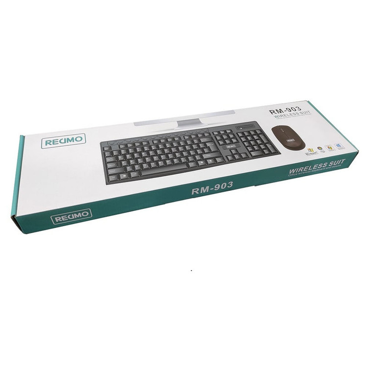 ست ماوس و کیبرد بی سیم رسیمو مدل RM-903یک محصول با کیفیت مثال زدنی است که این امکان را به شما می دهد تا بهصورت بیسیم به کامپیوتر یا لپتاپ و حتی موبایل و تبلت خود متصل میگردد. این امکان را به شما میدهد تا در هر کجا که هستید تا فاصله 10 متریبا این کیبورد و ماوس کار کنید و به دلیل فرکانس بسیار مناسب 2.4 گیگاهرتزی واقعی تداخل فاصله زمانی بین عملکرد ماوس و کیبرد وجود ندارد. به عنوان مثال میتوانید در هر حالتی که راحت هستید بر روی مبل بنشینید و با این کیبورد و ماوس بدون دیلی و تداخل عملکرد کار کنید. صفحه کلید این محصول به نحوی طراحی شده که خاصیت ضد آب و رطوبت را داشته باشد.طراحی ماوس این محصول به گونه ای است که علاوه بر زیبایی این امکان را به شما می دهد تا با هر دو دست به راحتی کار کنید و موردی برای افراد چپ و راست دست نداشته باشد. گیرنده USB این محصول بسیار کوچک طراحی شده، به صورتی که شما میتوانید بدون هیچگونه مزاحمتی آن را روی پورت USB لپتاپ،کامپیوتر ، موبایل و یا تبلت خود بگذارید بماند. همچنین میتوانید با وجود این گیرنده USB روی پورت USB لپتاپ آن را داخل کیف بگذارید و همراه با ماوس و کیبورد به آسانی با خود جابجا کنید. البته در داخل ماوس هم یک محل برای قرار دادن این گیرنده USB قرار داده شده تا در مواقعی که به آن نیاز ندارید گیرنده را درون ماوس بگذارید و ماوس را همراه با گیرنده راحتتر جابجا کنید. درکل میتوان گفت که این محصول شامل یک کیبورد شیک، کارآمد و مقاوم و یک ماوس زیبا و خوش دست است که هر دو بسیار خوش ساخت طراحی شدهاند و به صورت بیسیم و از طریق دانگل USB به دستگاه مورد نظر شما متصل میشوند. بنابراین برای افرادی که به یک ماوس و کیبورد بیسیم با طراحی شیک برای استفاده در منزل یا اداره نیاز دارند، یک انتخاب ایدهآل است.